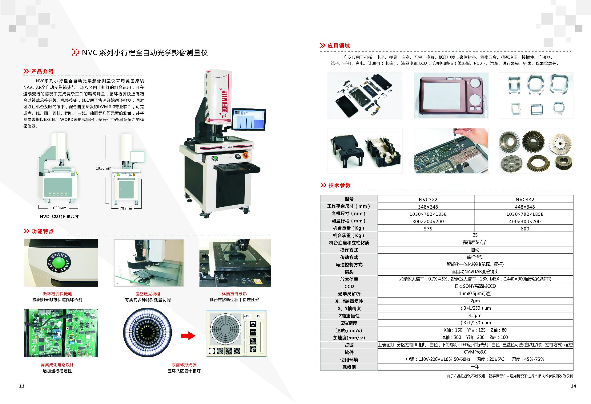 2.5次元四轴全自动光学影像测量仪NVC322产品介绍NVC一体式设计系列是本公司推出的新款全自动光学影像量测仪,X/Y/Z轴采用全闭环伺服控制系统,配合以美国原装NAVITAR镜头,U轴采用步进控制系统,配合以Motor Zoom技术,可任意变换倍率无需要校正,使用非常方便实现对各种复杂表面工件的精确量测。