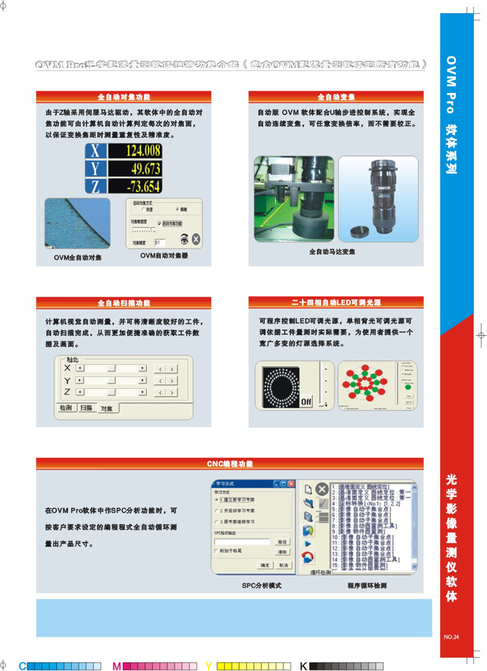 1、进口航空铝材,保证具有极高的稳定性及刚性。2、精密线性导轨和研磨级滚珠螺杆,配松下高性能伺服马达全闭环控制,高稳定性、高精度、速度快。3、SONY高分辨率彩色摄像机520TV线,保证拥有高品质的测量画面.4、自动变倍镜头,改变倍率后不需要重新选取比例尺。5、可程控三环八区LED表面冷光源、轮廓冷光源,使光源对测量要求的适性更加强大。6、德国HEIDENHAIN精密光学尺分辨率0.1μm。7、T-KING完全自主研发功能强大的全自动CNC测量软件,可自动编程及离线编程,自动检测。8、可选配英国Renishaw接触式探头或日本CCD激光位移传感器。 -